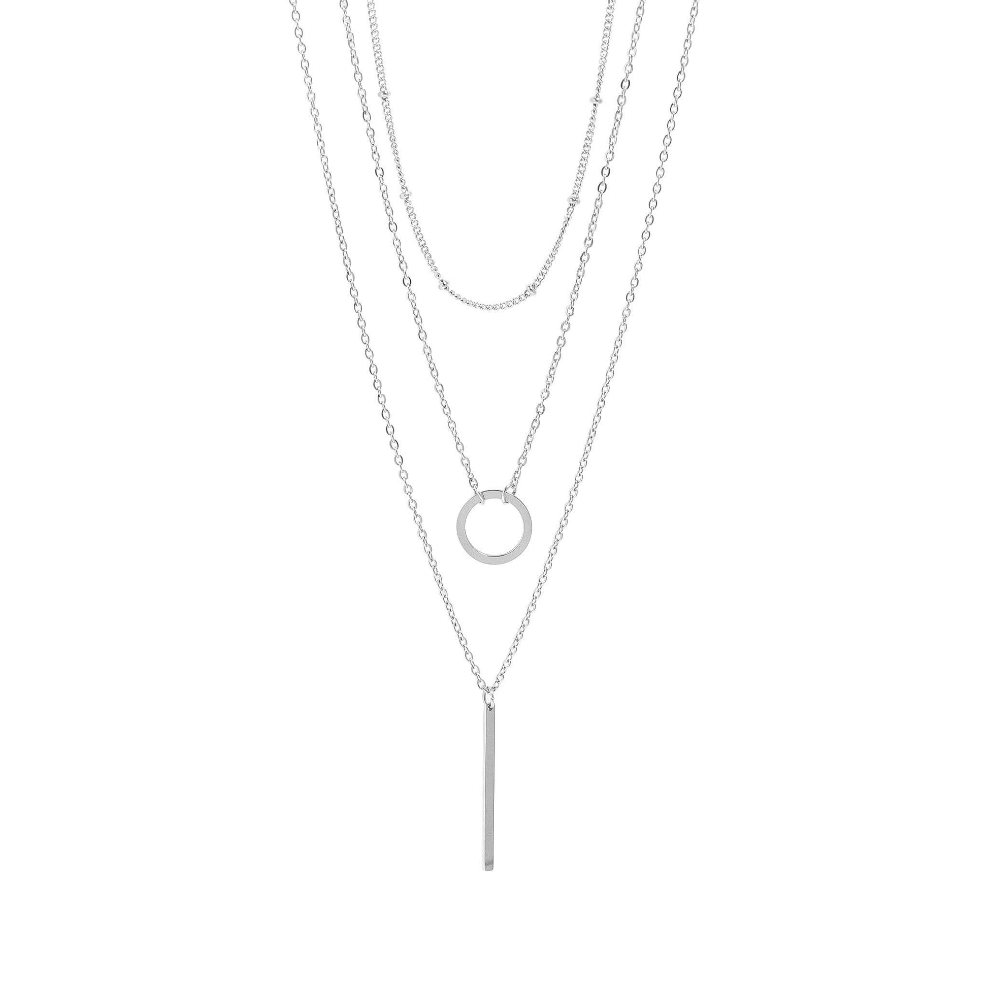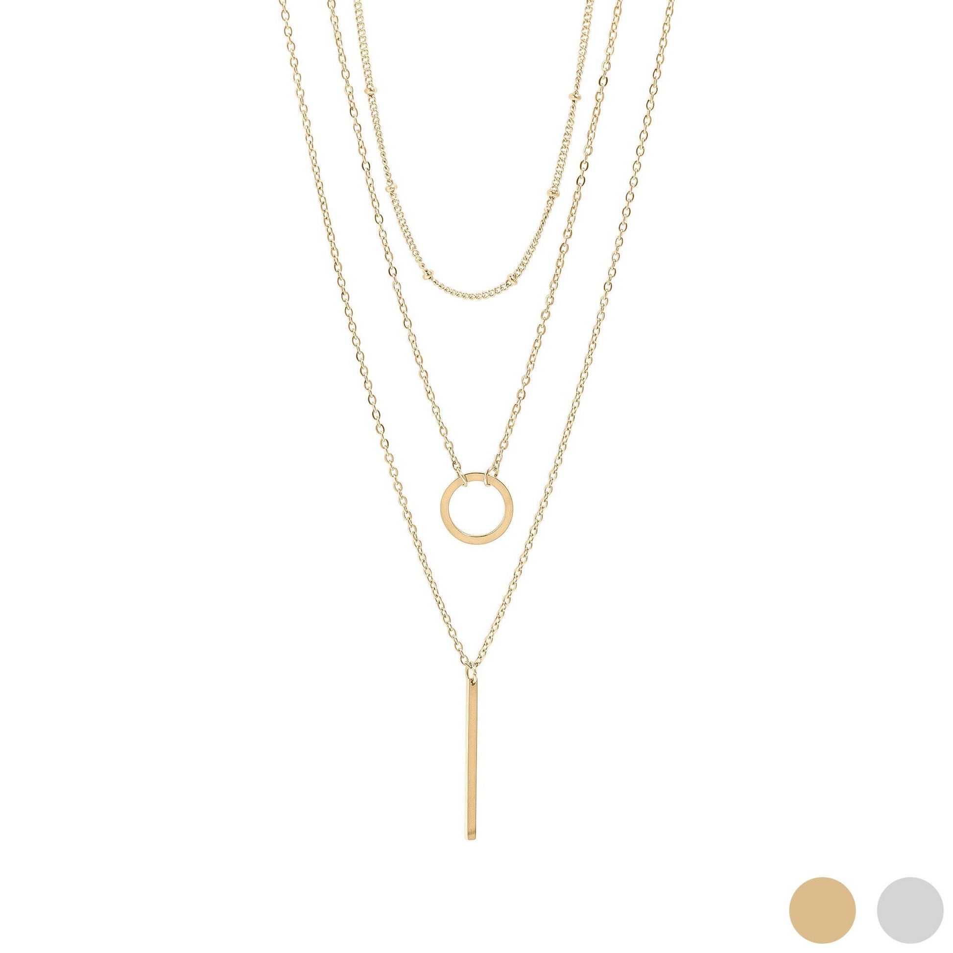 The Loop & Satellite 3-Row Layered Chain Necklace is a stunning everyday basic for every collection. Featuring 3 chains layered as a single necklace, this layered look is perfect for every season and adds a certain texture and interest to any outfit. ✦ 100% Waterproof, Non-tarnish, Hypoallergenic ✦ Quality That Lasts ✦ Designed for All Skin Types ✦ Perfect for Every Budget - PVD COATING - We use the process of PVD Coating our 18K Gold jewelry over 316L surgical grade stainless steel for a non-tarnish, hypoallergenic, polished finish that will hold up best to everyday wear and will never turn your customer's skin green. Approx. Chain Length: 15". 18", and 20" with 2" Extension Approx. Chain Width: 1.5mm Approx. Circle Pendant Dimensions: 13mm x 13mm Approx. Bar Pendant Dimensions: 30mm x 2mm Approx. Weight: 7.16 grams
