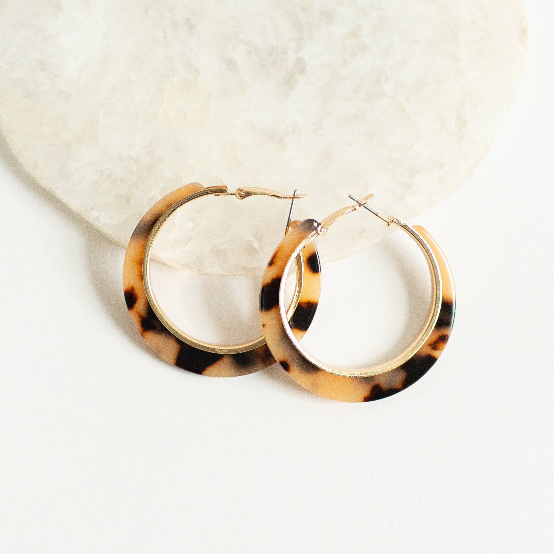 The Aria Earring is a timeless tortoise and gold-tone hoop earring.