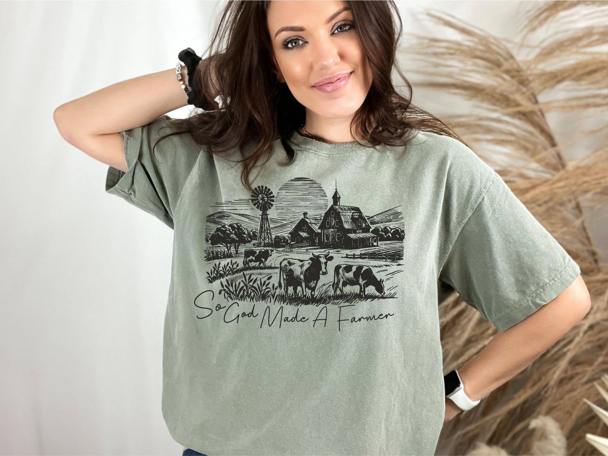 GOD MADE A FARMER GARMENT DYED WESTERN GRAPHIC TEE COUNTRY AGRICULTURE FARMER * Unisex Sizing True to size *Professionally screenprinted * Short sleeve, crew neck tee. * Care Instructions: * Wash inside out in cold water